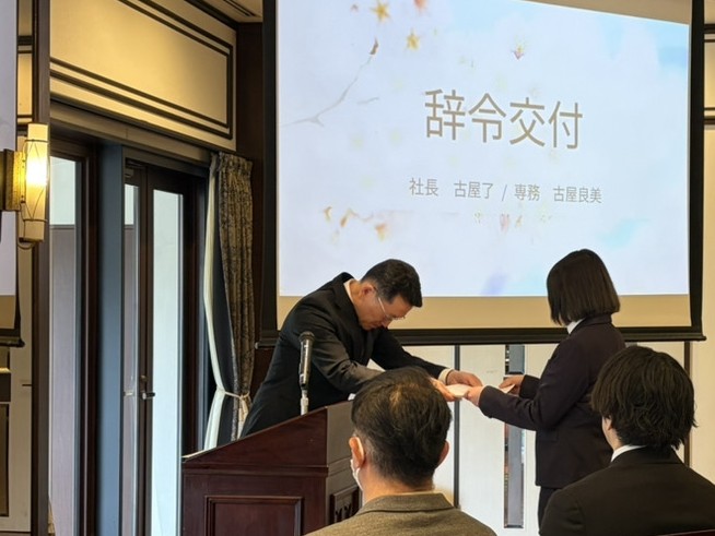入社式では、辞令交付をし、新入社員のふたりから決意発表もしてもらいました